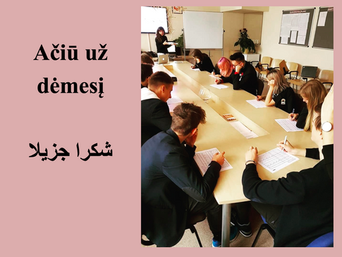 The project will be implemented in a form of integrated lessons, using interactive tools, visual materials, organizing workshops, discussions and competitions. This project is implemented by a team of qualified specialist of the Middle East, who are working with young people at the Institute of Asian and Transcultural Studies of Vilnius University.
